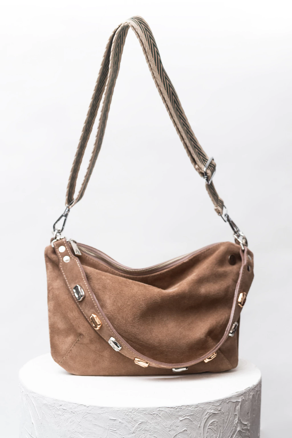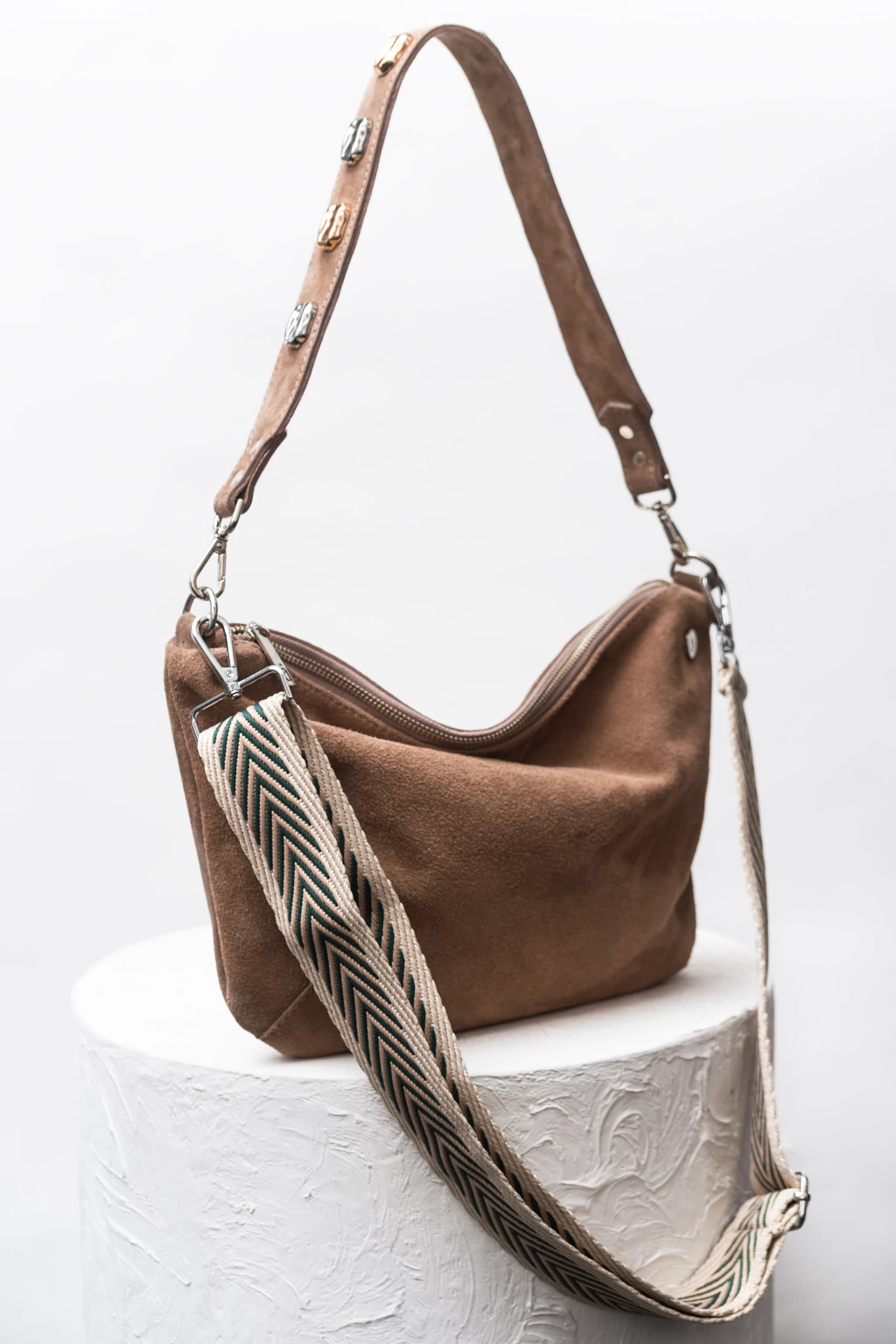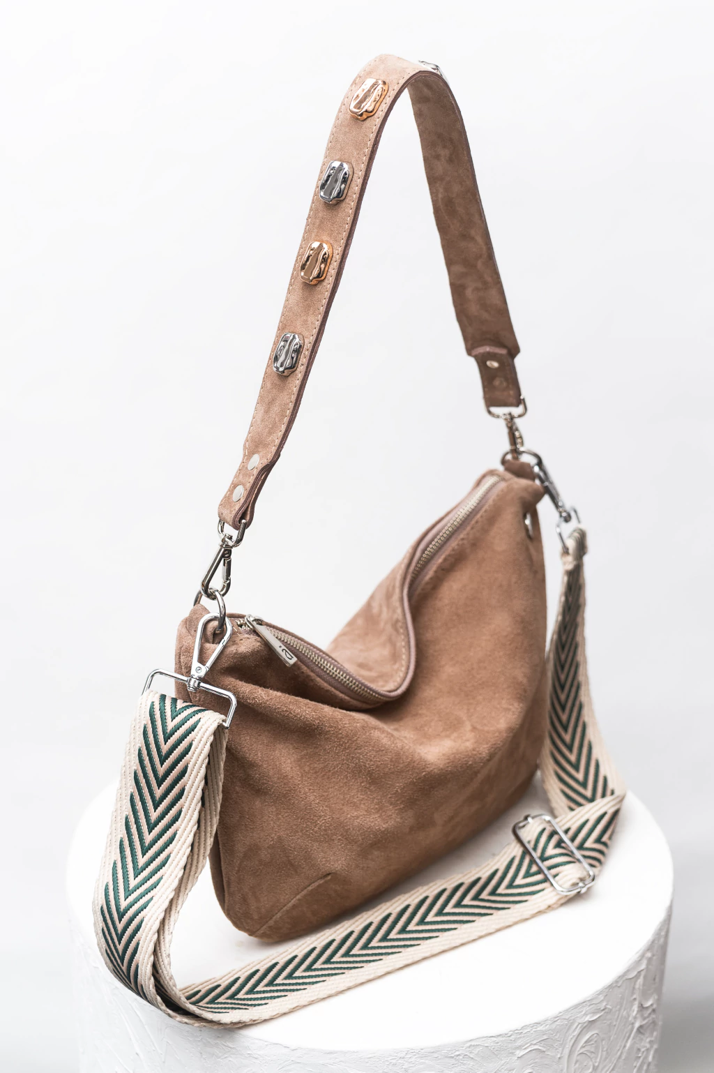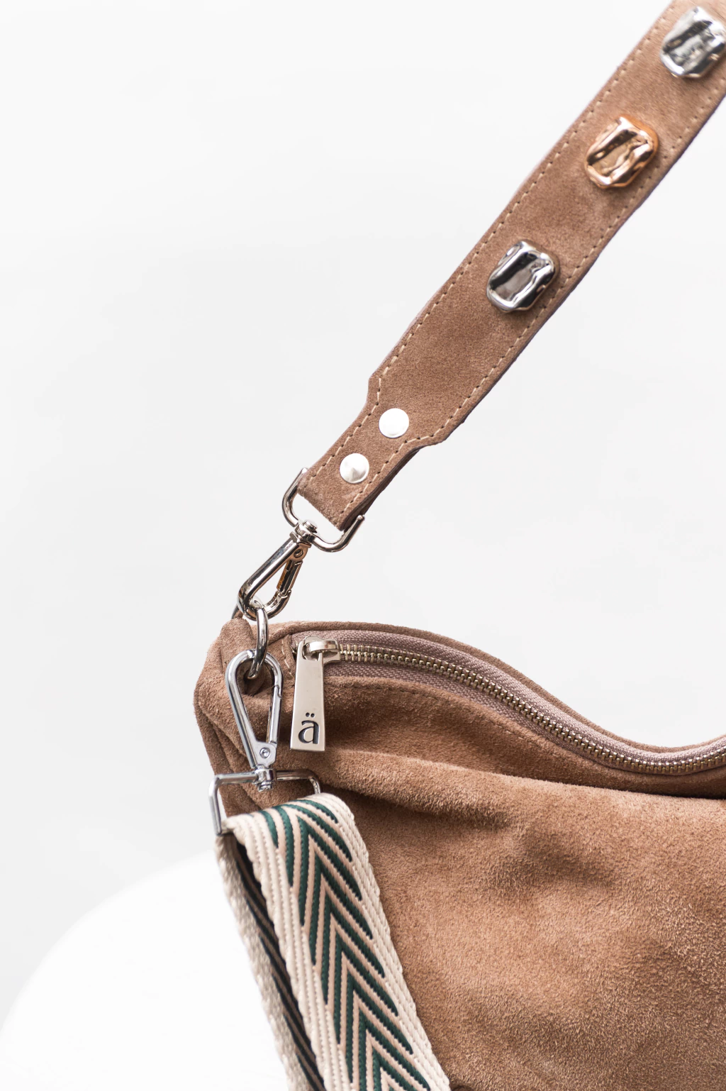 Tiene una manija corta al hombro con apliques combinados en oro y plata para que no tengas que preocupatte en combinarla, sumado a su manija larga bordada extraíble y regulable.