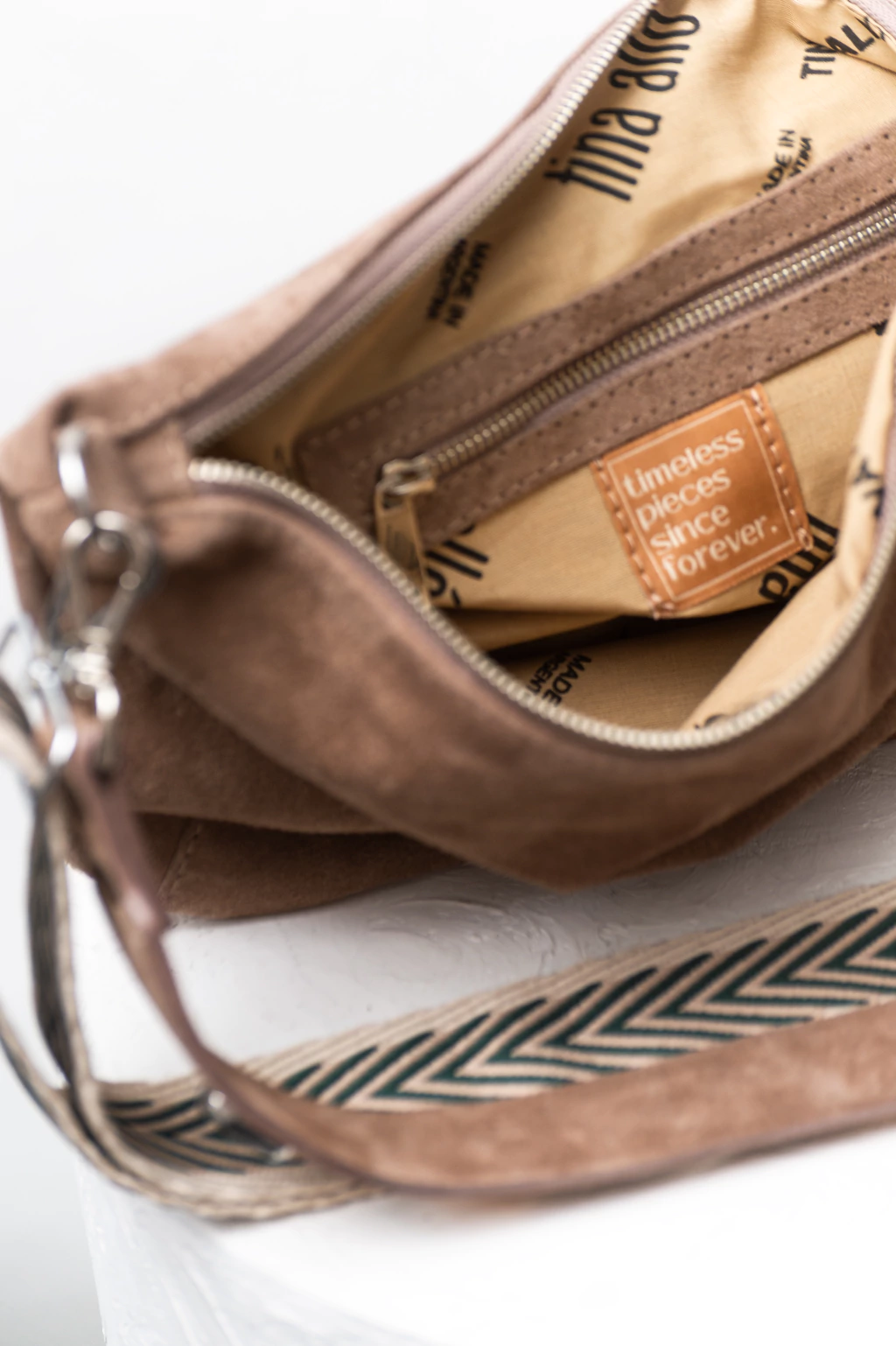 - Manija larga bordada con colores a tono del cuero regulable y extraible.