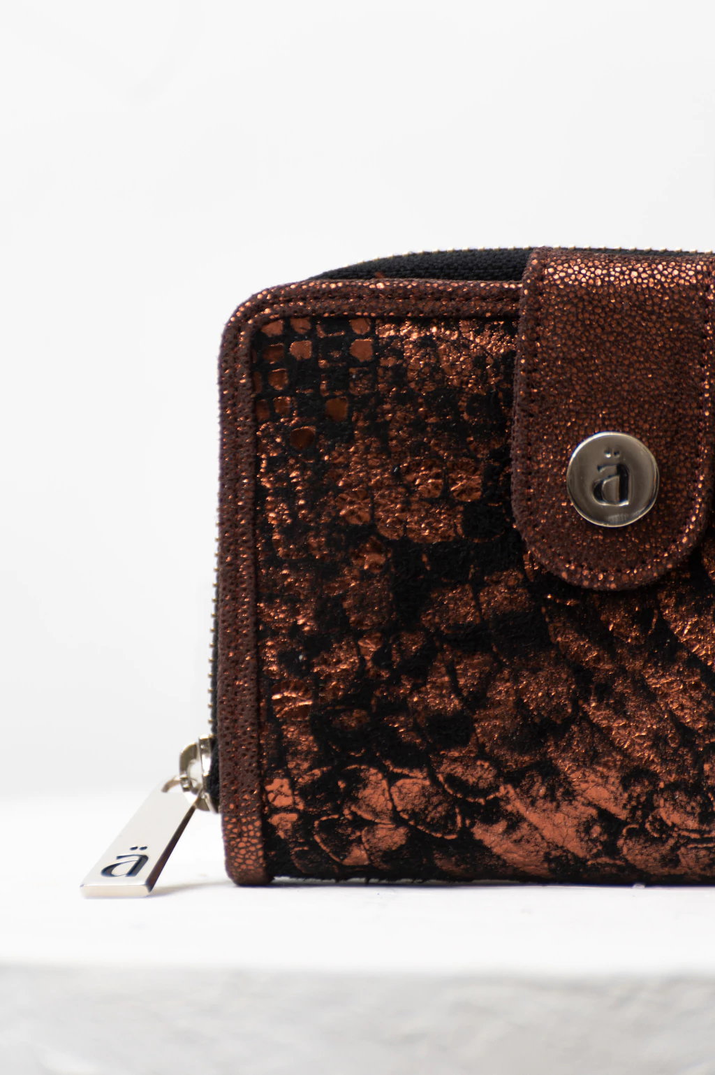 - Chapita de marca en solapita de cuero con broche a presión clic.