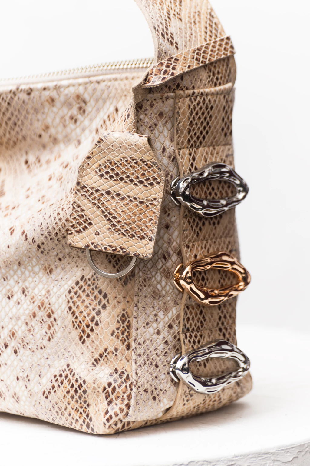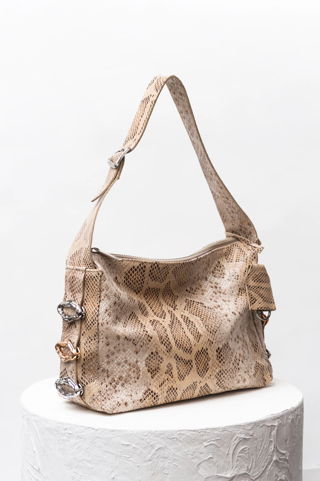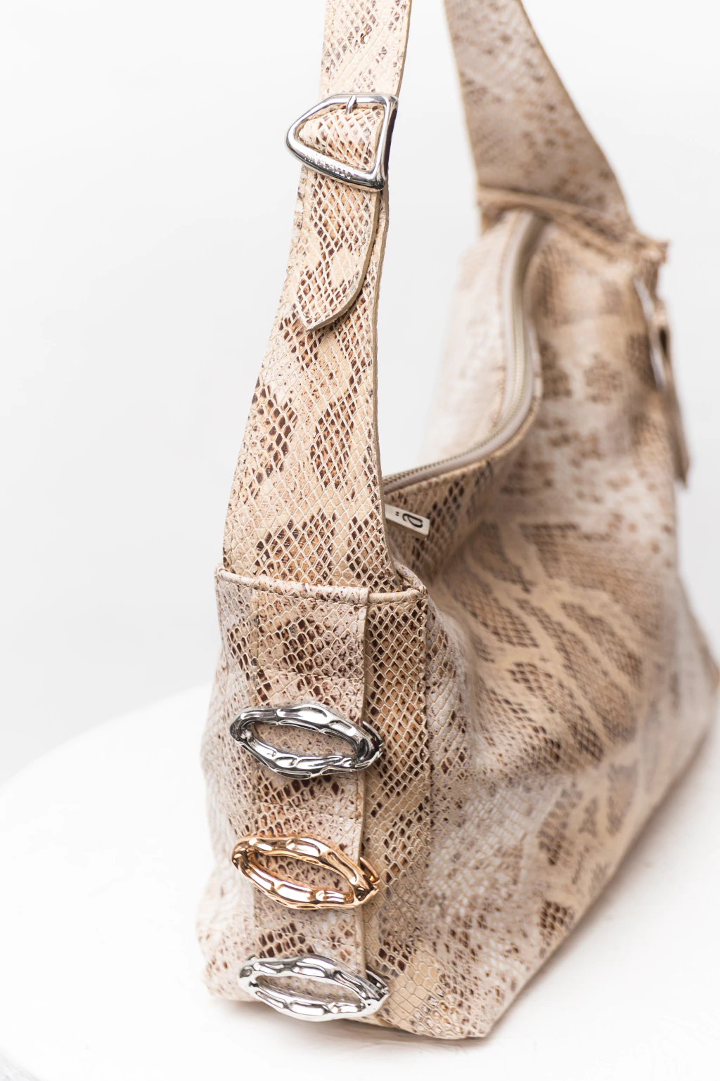 - Manija al hombro regulable con hebilla metálica exclusiva con logo de marca grabado.
