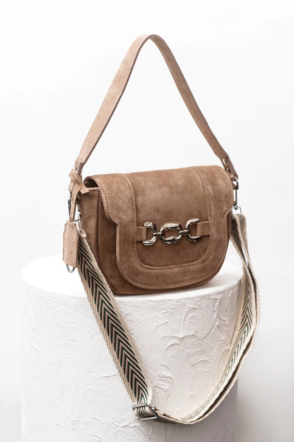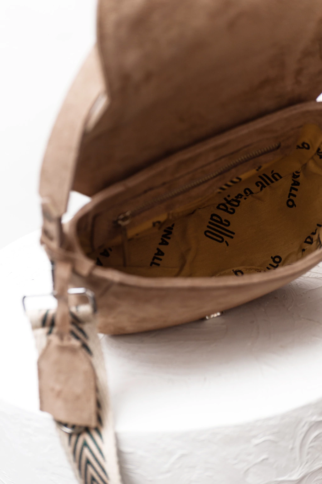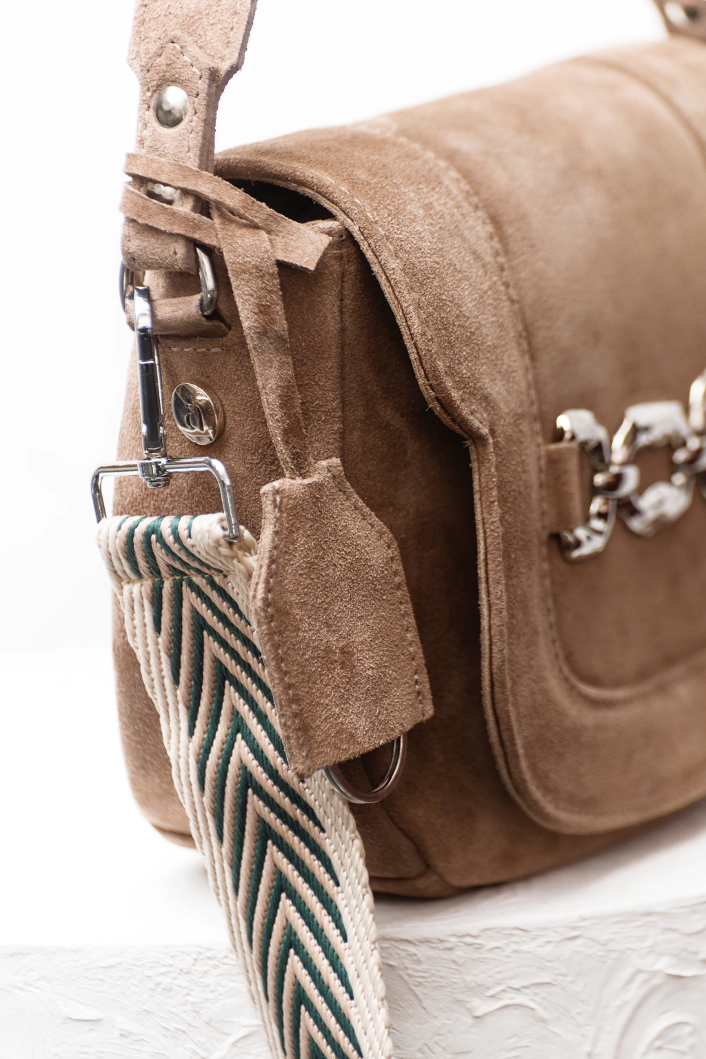 - Manija larga bordada con colores a tono del cuero regulable y extraible.