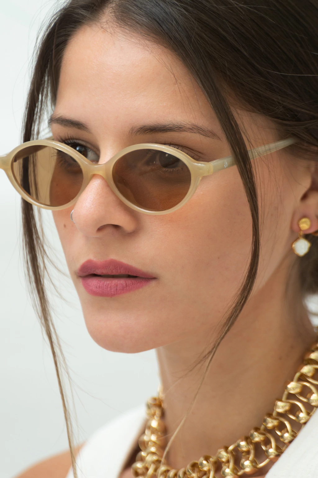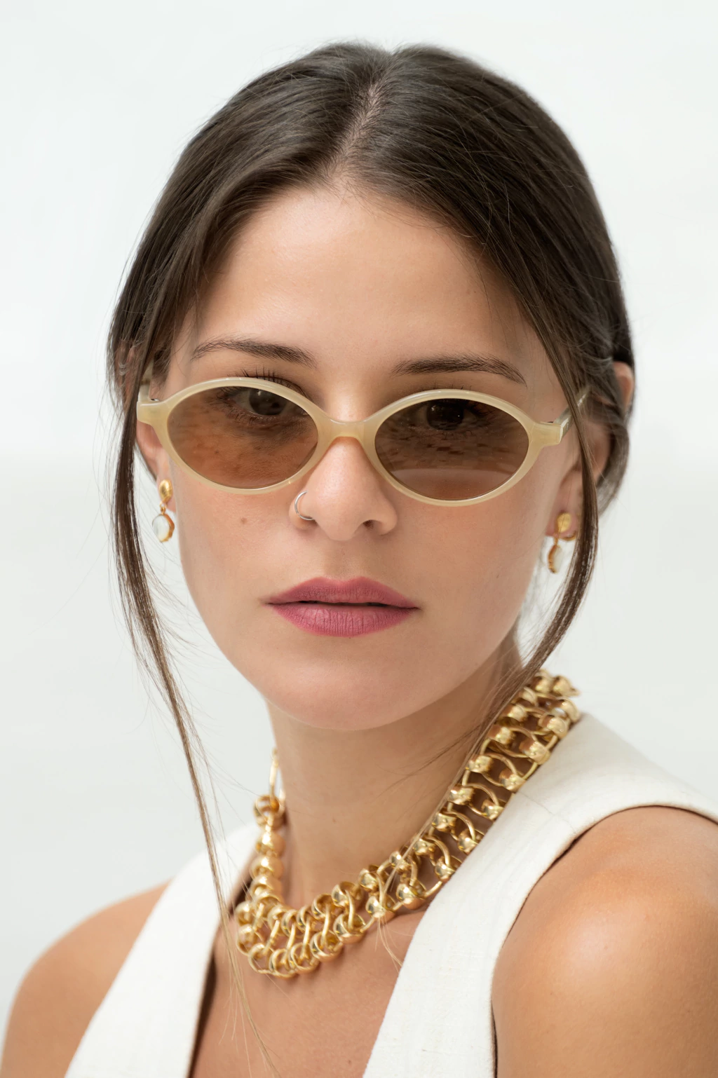 Lentes de diseño confeccionados exclusivamente para nuestra marca, con logo metalizado grabado en cada lateral, morfológia redondéada con patas finas.