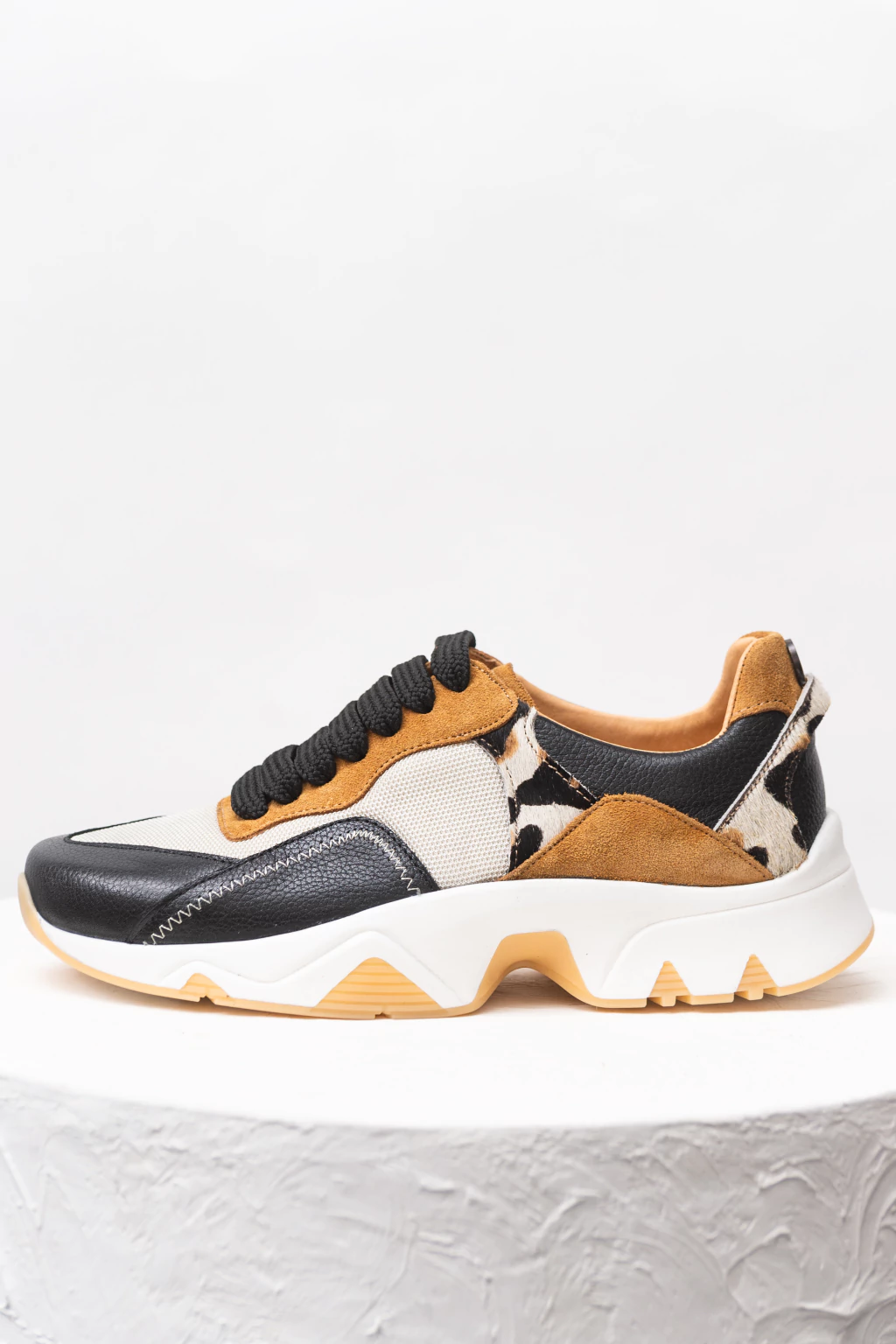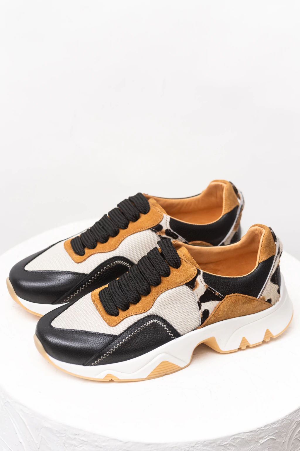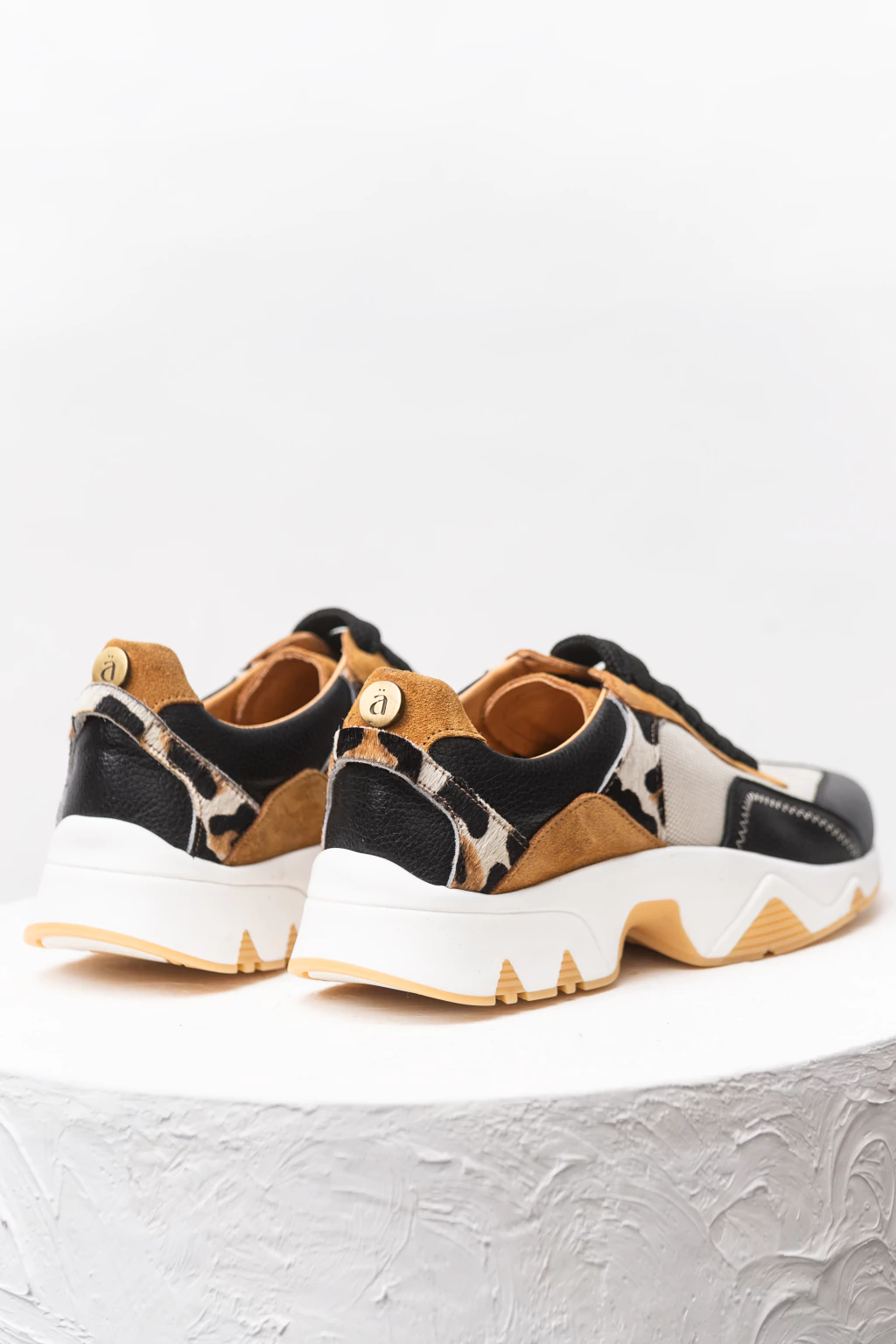- Cuero pelo print, gamuzado golden, cuero liso negro y detalles de tela bondeada con espuma a tono marfil.